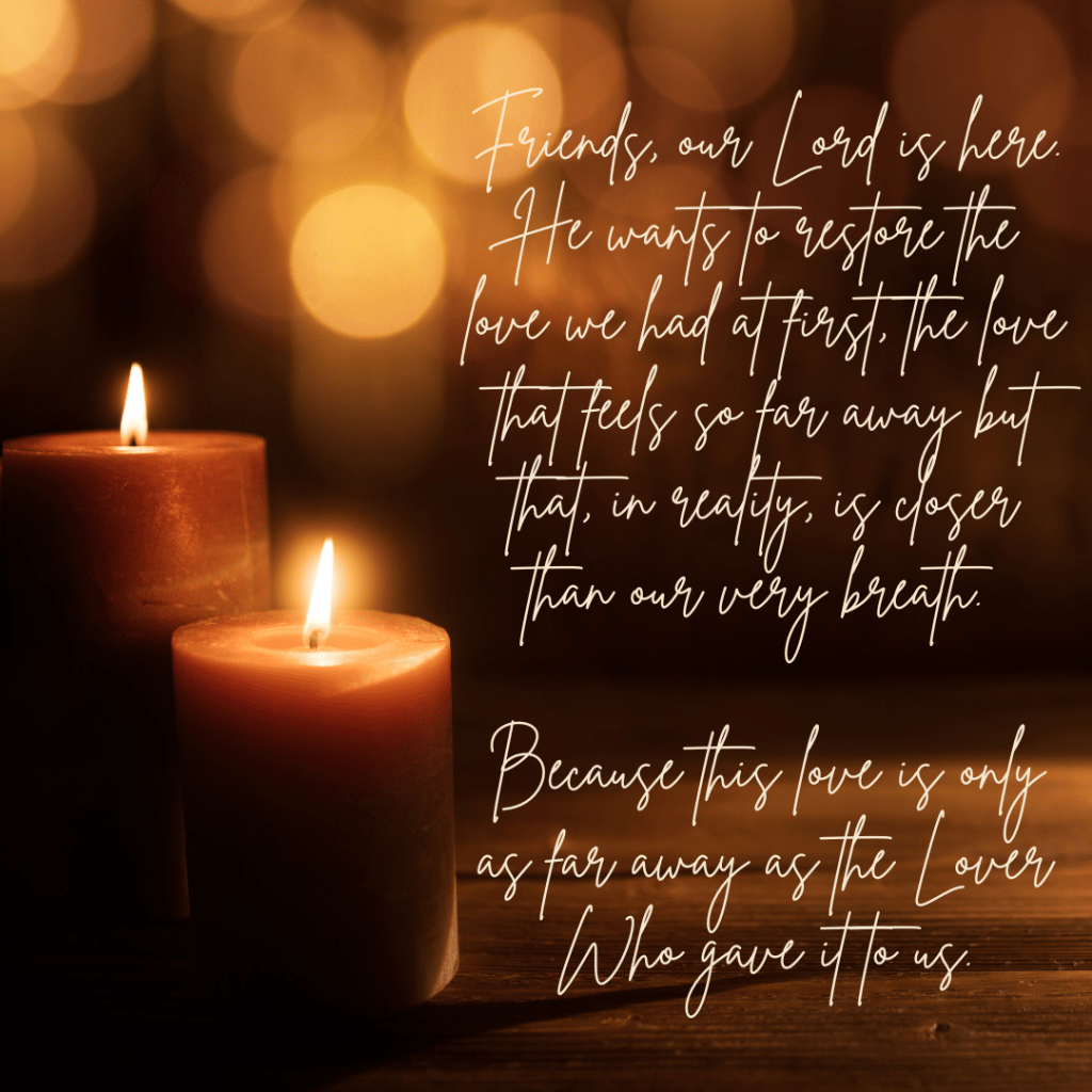 Friends, our Lord is here. He wants to restore the love we had at first, the love that feels so far away but that, in reality, is closer than our very breath. Because this love is only as far away as the Lover Who gave it to us. I pray you’ll take some time this week to think about the places in your life where maybe you’ve lost some of your love, those places where you think the fire has died and where you feel stretched out to the maximum. I pray you’ll reflect on the joy you once had and give yourself the space to desire that again. And I pray that slowly, gently, you’ll allow yourself to be open to a renewal of heart, and that in these places you will find the God Who is waiting to bring your joy back to you.